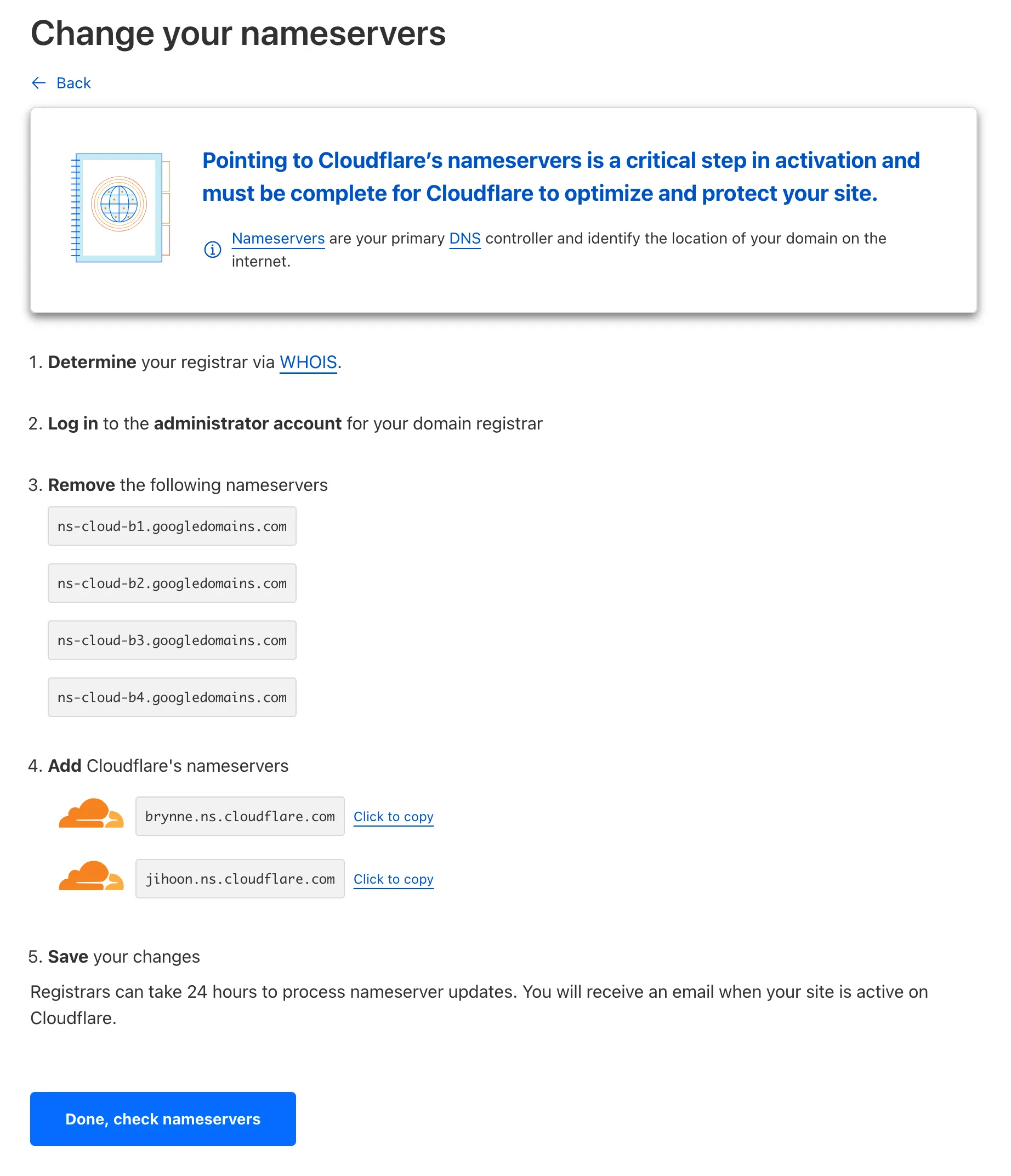 次に進むと、ネームサーバーの変更手順が示されたページに遷移する。 Cloudflare のネームサーバー名が表示されているので控えておく。