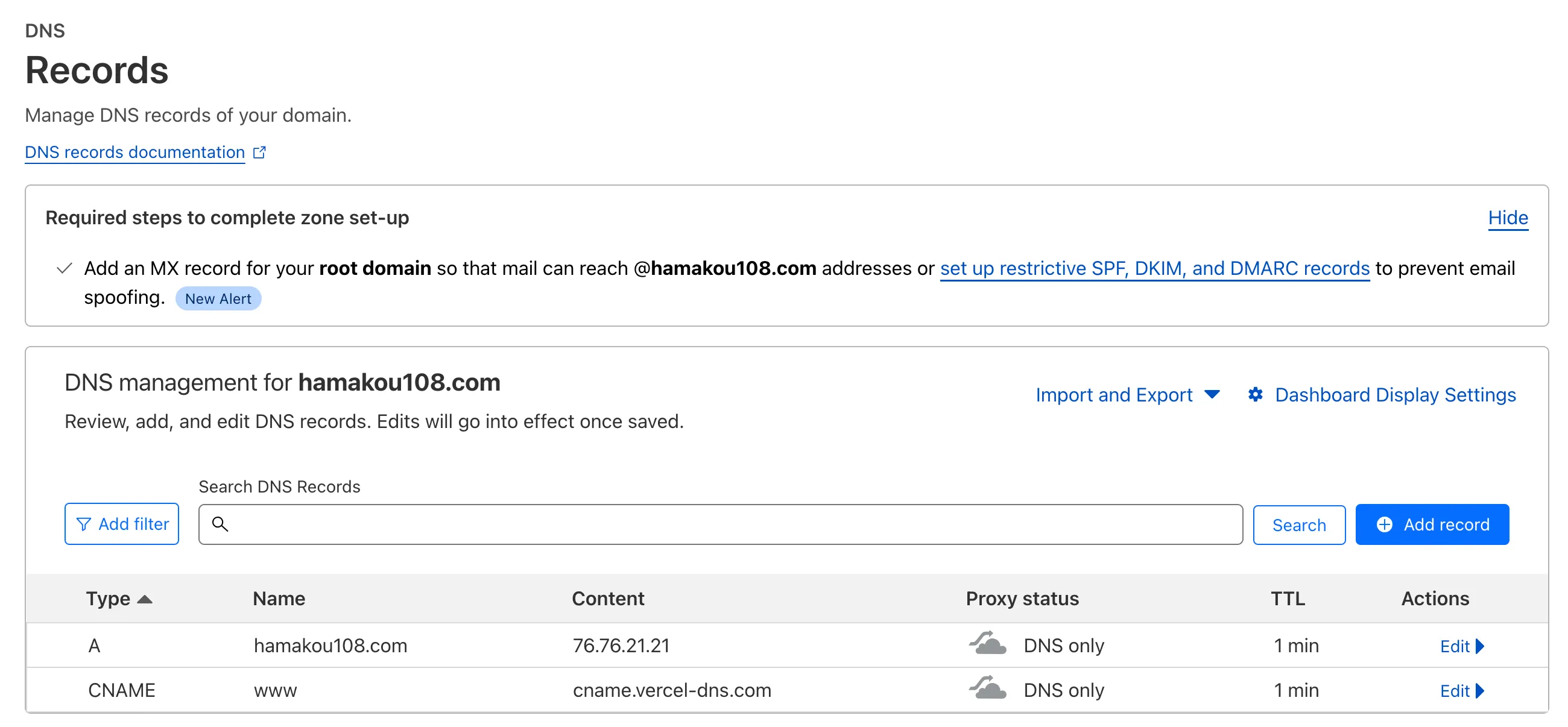 また Proxy status は一旦 DNS only に設定した。最初はこれを Proxied に設定していたのだが、 hamakou108.com へのリクエストが hamakou108.com に 308 リダイレクトされるようになり、ブラウザで Too Many Requests エラーになる事象が発生してしまった。時間経過 (数時間〜数日程度?) で直るようだったが、何かしら他の問題が発生した場合に原因の切り分けが難しくなりそうだったなので、一旦設定を後回しにした。