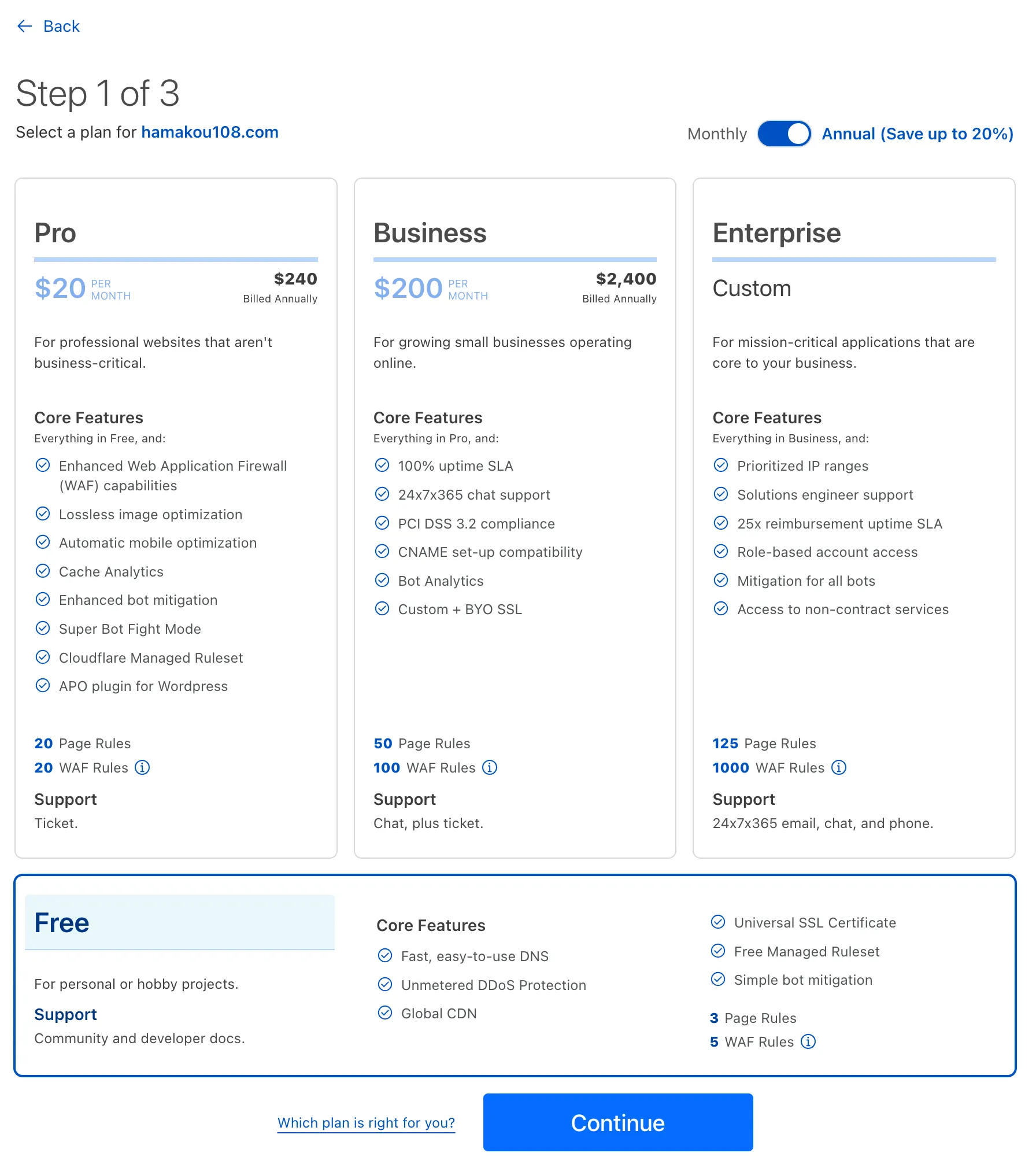 次に進むと、プラン選択のページが続く。今回は特にエッジの機能を求めているわけではないので Free を選択した。