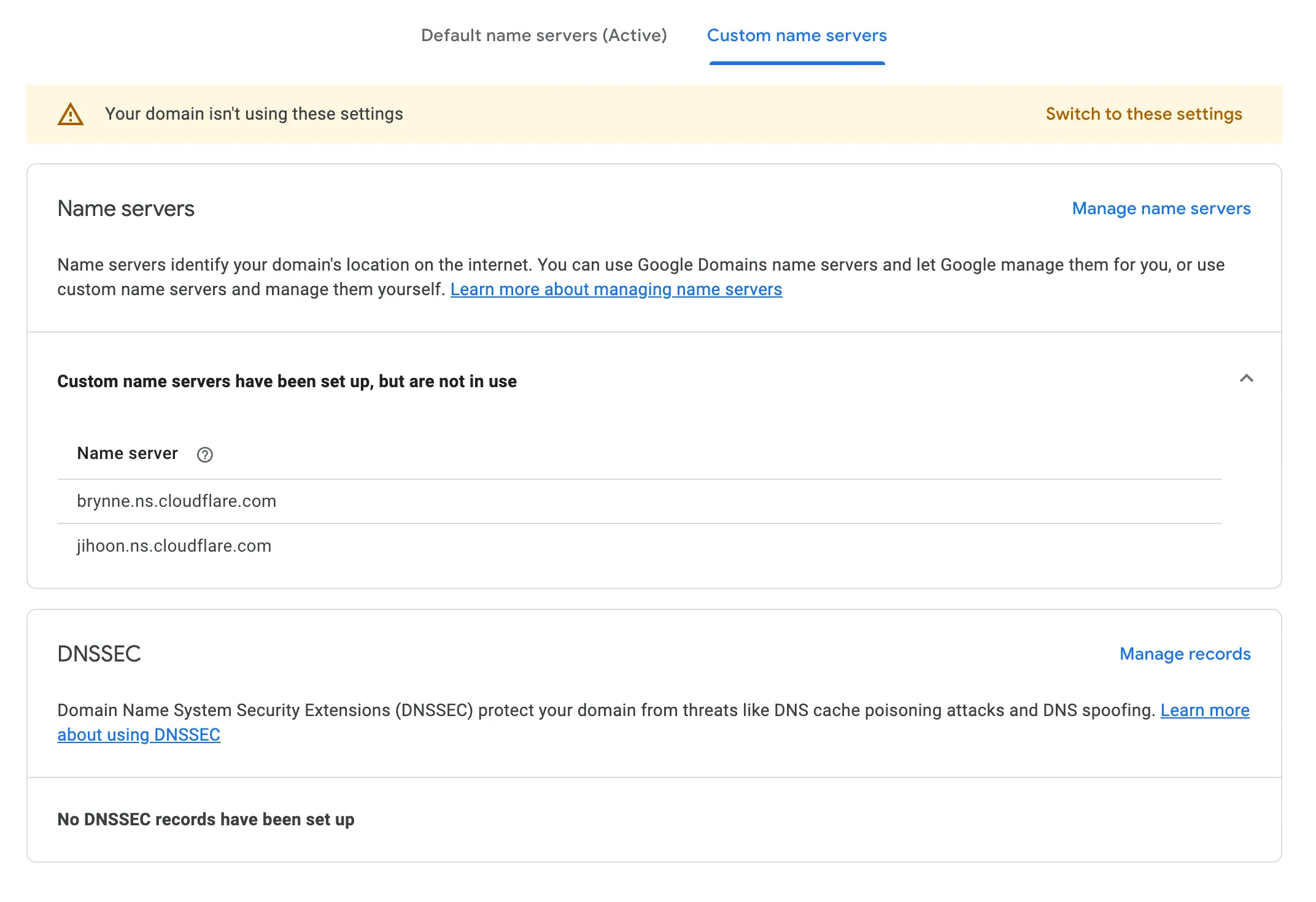 Google Domains の DNS 設定のページを開き、 Custom name servers のタブを選択する。 Manage name servers をクリックして、先程の Cloudflare のページに記されていたネームサーバーを登録する。ここまでの設定が一通り済んだら、 Switch to these settings を押してネームサーバーを変更する。